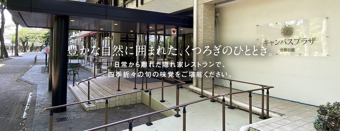 緑豊かな広池学園キャンパス内に佇む、キャンパスプラザ会員会館 レストランまんりょうは、どなたでもゆったりとお食事をお楽しみいただける隠れ家レストランです。